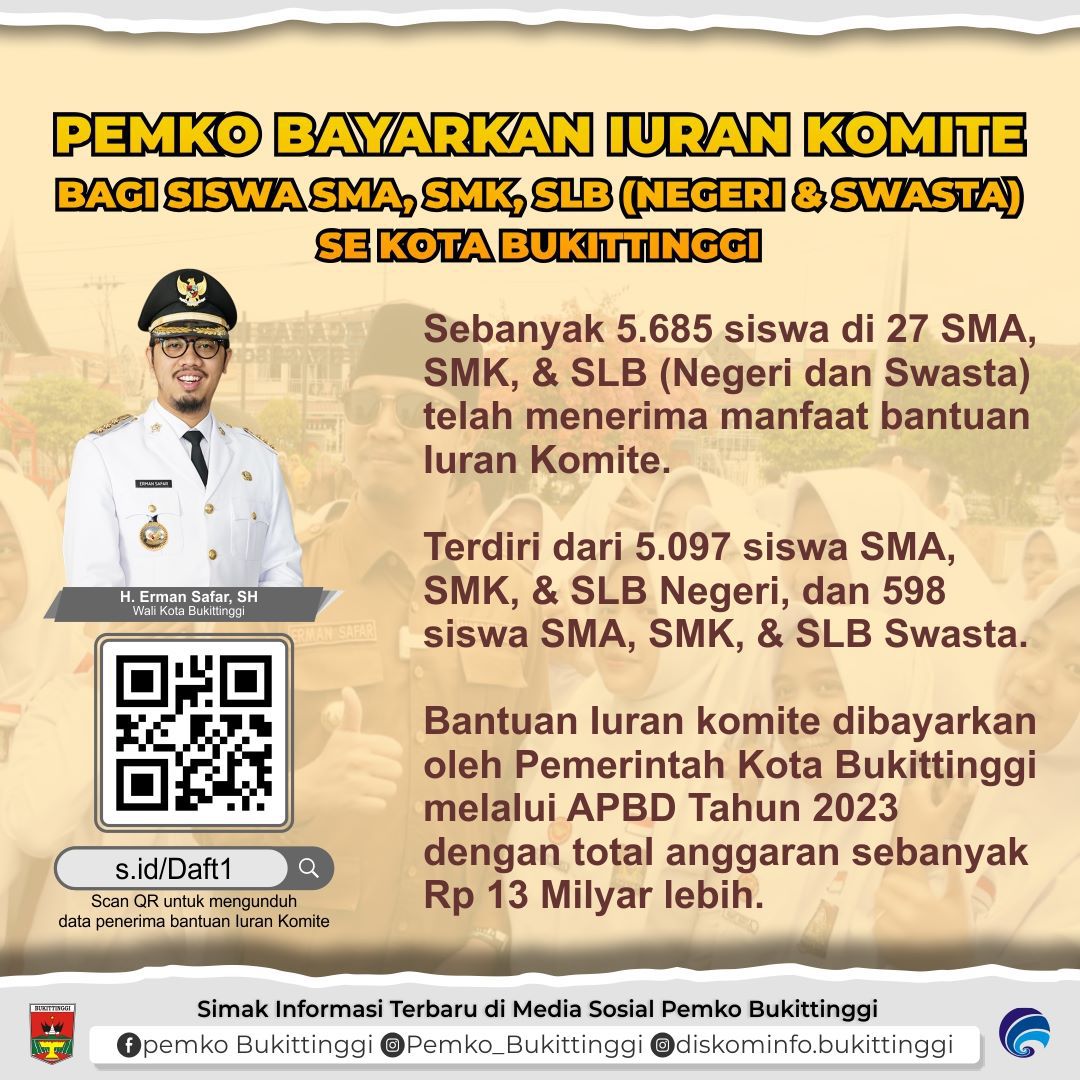 BUKITTINGGI — Pemerintah Kota (Pemko) mengalokasikan dana di APBD 2023 sebesar Rp13 miliar lebih, untuk bantuan iuran komite bagi pelajar Bukittinggi di tingkat SMA sederajat.