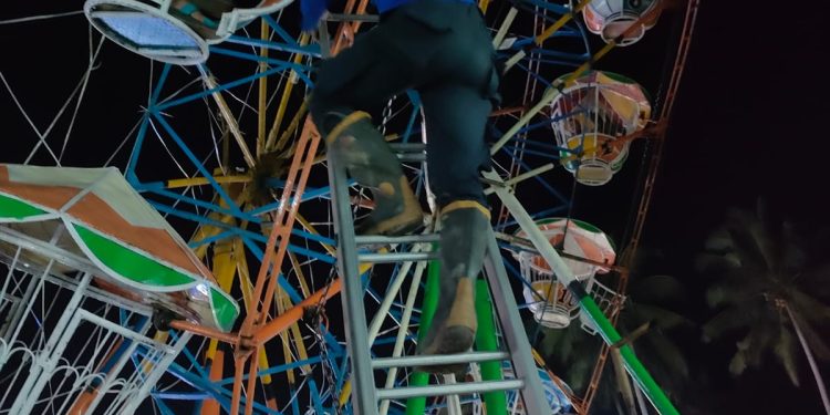 SUMBARTIME.COM, Payakumbuh — Pemadam Kebakaran bersama Tim Reaksi Cepat (TRC) Kota Payakumbuh langsung tancap gas bergerak cepat untuk mengevakuasi pengunjung Pasar Malam yang terjebak di atas Wahana Biang Lala yang miring karena patah, di Kelurahan Talang, Kecamatan Payakumbuh Barat, Selasa (9/5) sekitar pukul 21.35 WIB.