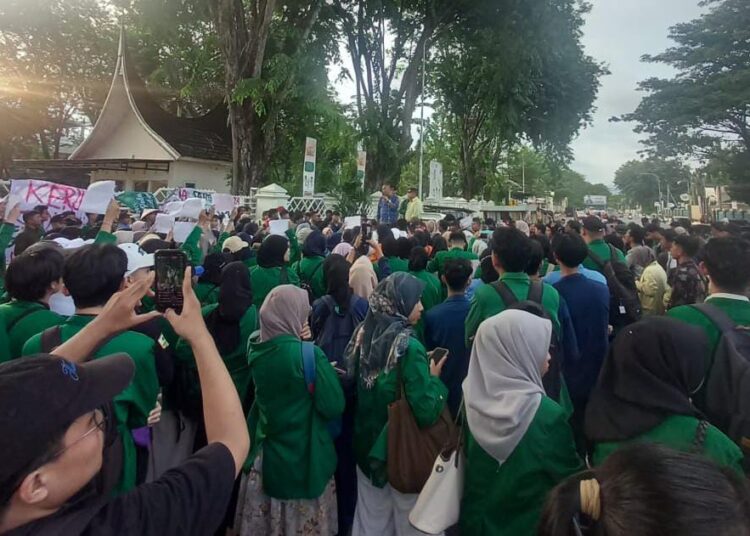 Sumbartime – Mahasiswa dan Serikat Buruh Sumatera Barat (Sumbar) mengadakan demonstrasi di depan Kantor Gubernur Sumbar pada Kamis (2/5). Demonstrasi ini diselenggarakan oleh Badan Eksekutif Mahasiswa (BEM) se-Sumbar sebagai bagian dari peringatan Hari Buruh Internasional atau May Day yang jatuh pada setiap 1 Mei.