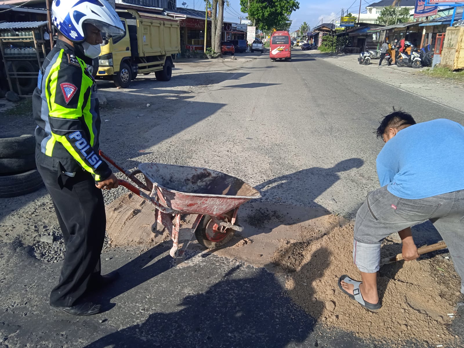 SUMBARTIME.COM,-Bukittinggi, Senin 23 Mei 2022.Satlantas Polres Kota Bukittinggi mengambil Inisiatif dengan menimbun jalan yang berlobang dan bisa menyebabkan kecelakaan lalu lintas. Jalan Nasional yang berada di wilayah hukum Polres Bukittinggi ada beberapa titik yang berlobang dan mengganggu pengendara yang melewati jalan tersebut.