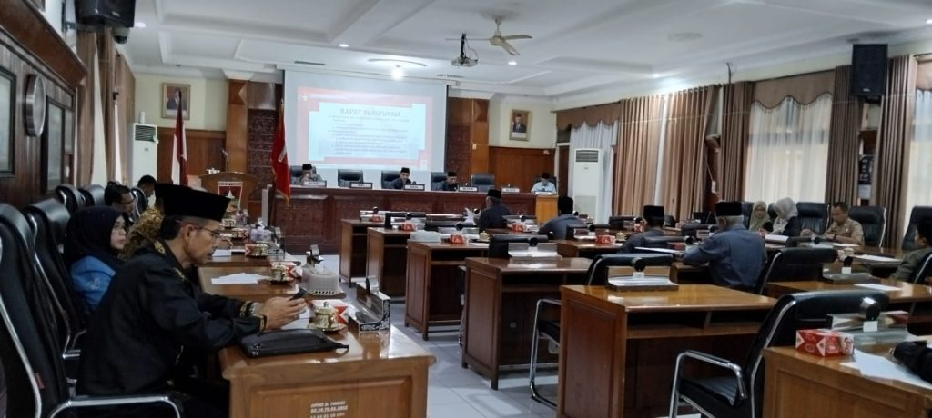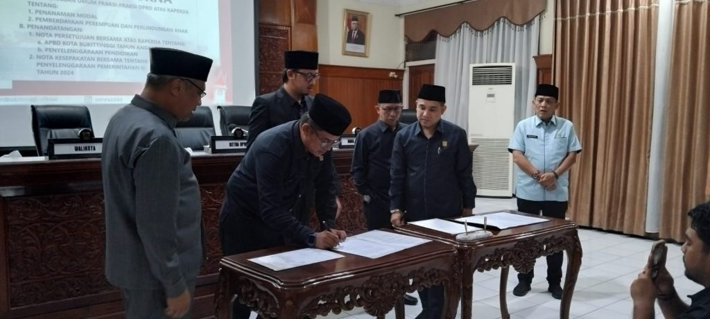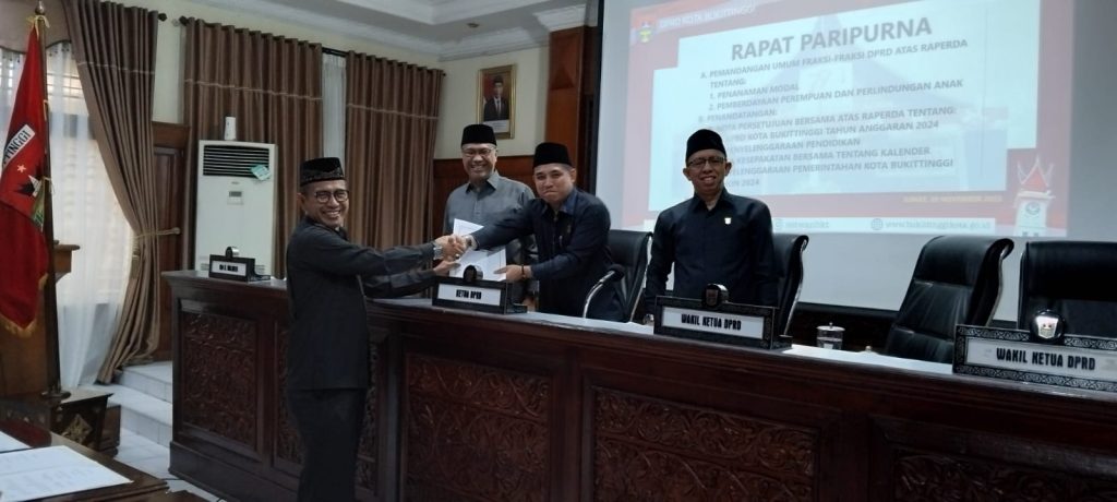 BUKITTIGGI – DPRD Kota Bukittinggi, Sumatera Barat (sumbar), menggelar Rapat Paripurna Pemandangan umum fraksi atas Raperda dan Penandatanganan Nota Persetujuan bersama Tahun Anggaran 2024 di Bukittinggi, Kamis (30/11/2023).