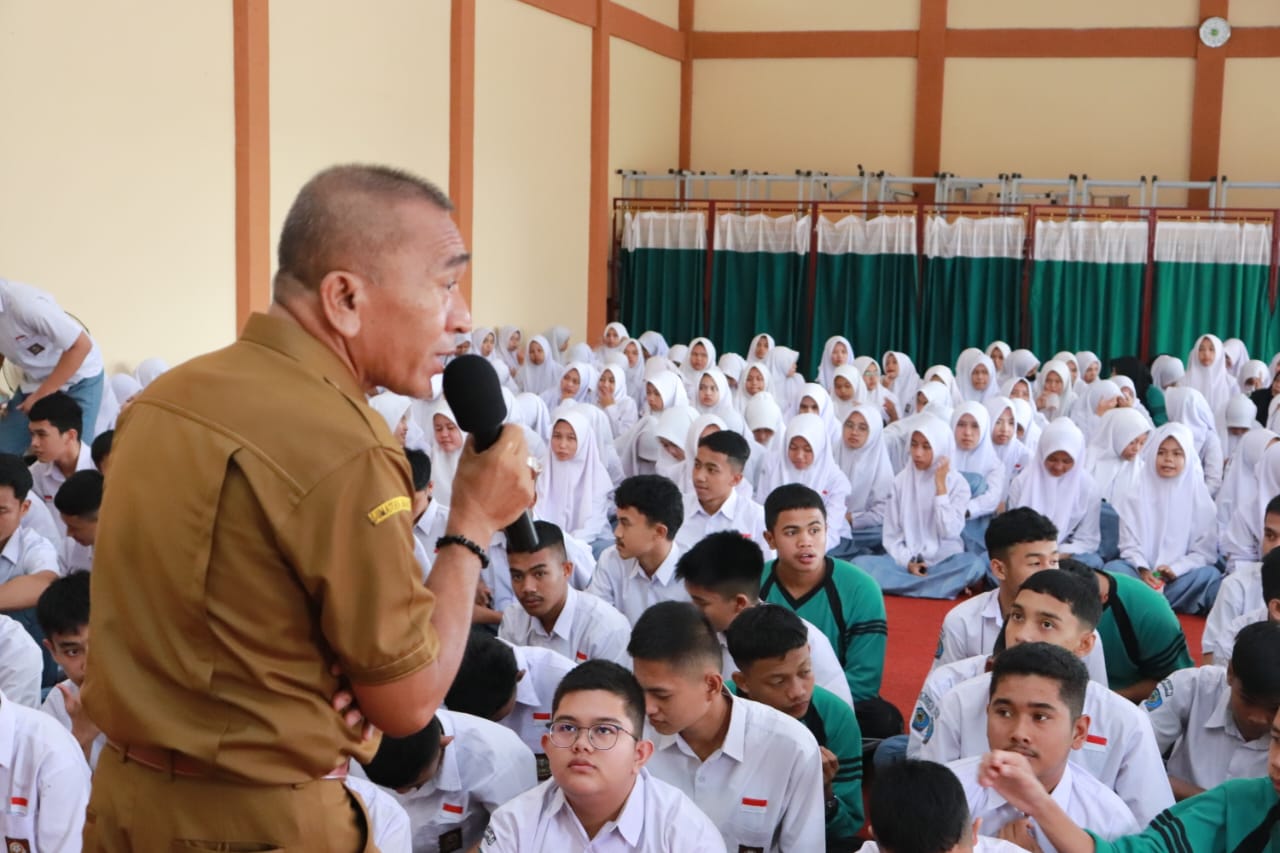 Junaidi memaparkan materi tentang bulliying dan UU ITE bersama Staf Diskominfo Surya Dwi Putra di hadapan ratusan siswa kelas 10 di sekolah yang dipimpin oleh Irma Takarina itu.
