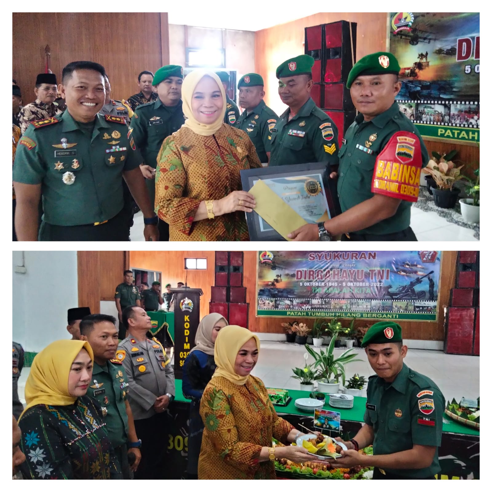 Dari liputan media ini, resepsi HUT TNI ke 77 juga dihiasi dengan pemotongan tumpeng oleh Dandim 0309/Solok dan ketua DPRD kota Solok, dan diberikan kepada para prajurit berprestasi.** Ega