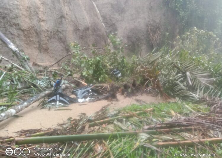 Akibatnya, dua sepeda motor tertimbun material longsor, menutup akses jalan sekitar pukul 15.49 WIB. Belum ada laporan mengenai korban dalam peristiwa ini.