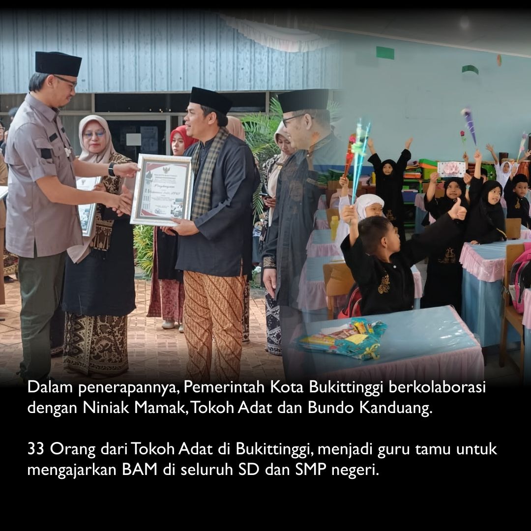 BUKITTINGGI — Sebanyak 33 orang dari Tokoh Adat di Kota Bukittinggi, menjadi guru tamu untuk mengajarkan BAM di seluruh SD dan SMP negeri di kota itu.