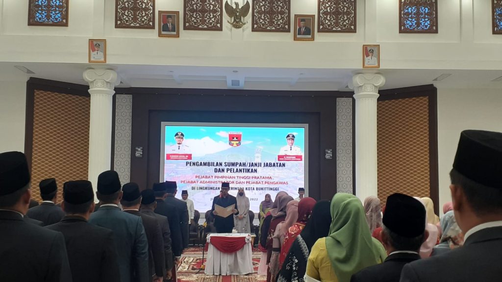 Sumbartime.com,- Jelang pergantian tahun 2022 – 2023 dan sejalan perubahan SOTK baru juga Walikota Bukittinggi H. Erman Safar.,SH didampingi Sekretaris Daerah Drs. Martiaswanto.,M.M & Asisten Pemko Bukittinggi Jum’at (30/12) sore bertempat di Balairung Kediaman Rumah Dinas Walikota Bukittinggi di Jalan Perwira Belakang Balok lakukan Pengambilan Sumpah / Janji dan Pelantikan Pejabat Pimpinan Tinggi Pratama Pejabat Administrator dan Pejabat Pengawas di Lingkungan Pemerintah Kota Bukittinggi.