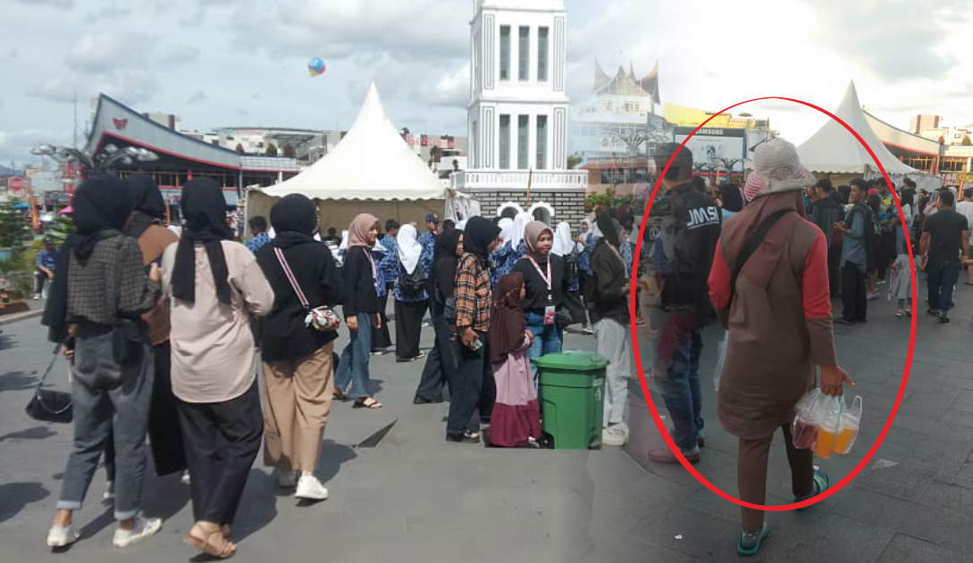 Ibu berhijab biru, baju warna krem dan celana coklat membawa minuman lima bungkus di tangan kiri dan lima bungkus di tangan kanan, terlihat menghampiri setiap wisatawan yang ada di taman Jam Gadang.