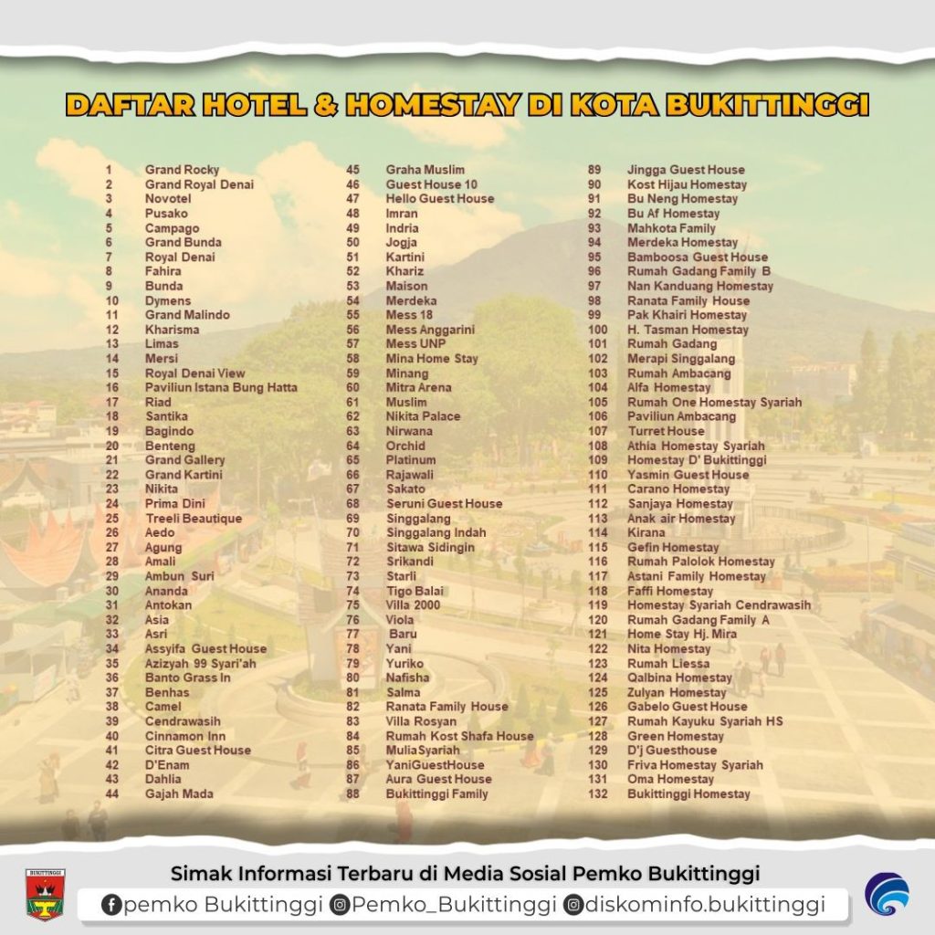 Sebanyak 132 Hotel & Home Stay yang ada di Kota Bukittinggi tak terlepaskan dari perhatian pemerintah kota Bukittinggi. Hal ini di karenakan daerahnya yang menjadi tujuan utama para wisatawan dalam maupun luar daerah berkunjung ke provinsi Sumatera Barat, Kota Bukittinggi khususnya.